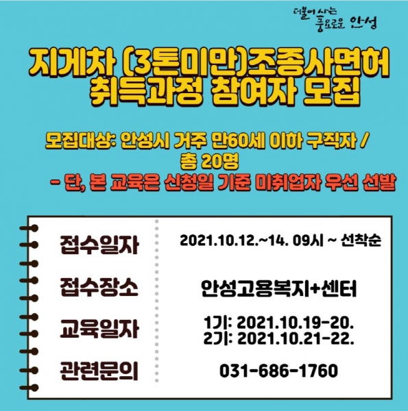 [충청뉴스큐] 안성시는 물류센터 등 현장특화 전문 기능인력 양성을 통한 중장년층 등의 취업 지원을 위해 오는 12일부터 건설기계조종사면허증 취득과정에 참여할 교육생 20명을 모집한다고 밝혔다.