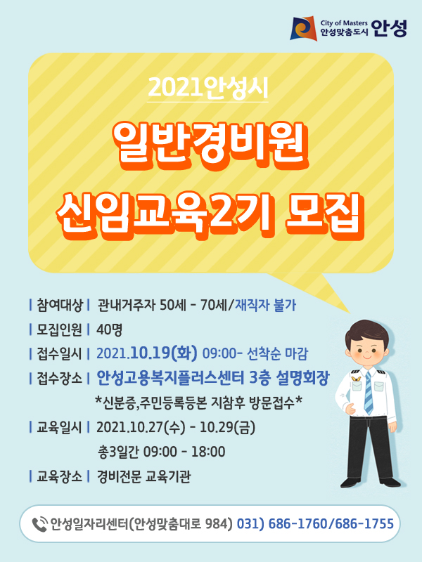 [충청뉴스큐] 안성시는 경비원 취업을 위한 필수 교육인 ‘일반경비원 신임교육’의 교육생 40명을 오는 19일부터 모집한다고 밝혔다.