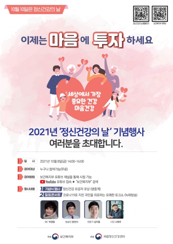 이날 행사는 “이제는 마음에 투자하세요. 세상에서 가장 중요한 건강, 마음 건강”이라는 주제로 1부 ‘정신건강의 날 기념식’과 2부 ‘힐링콘서트’로 구성되어 진행된다.