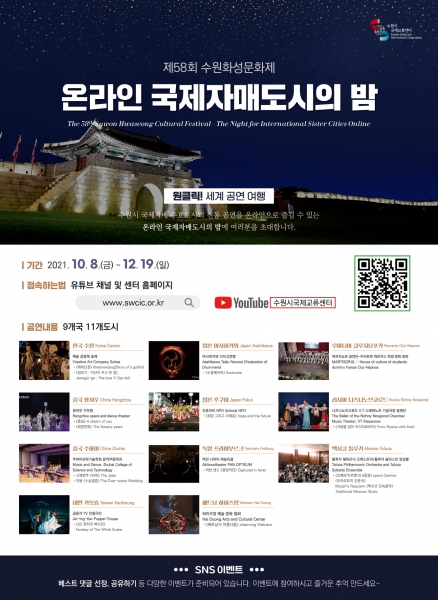 염태영 수원시장은 “코로나19 확산 방지를 위해 정성껏 준비했던 프로그램을 진행할 수 없어 안타깝지만 온라인으로 더욱 풍성하게 즐길 수 있도록 챙겼다”며 “마스크 너머 행복한 미소를 나눌 수 있는 날을 기대하며 수원시와 국제 자매·우호도시 시민 모두가 아쉬움을 달래고 위로를 얻는 시간이 되길 바란다”고 말했다.