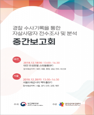 [충청뉴스큐] 보건복지부와 중앙심리부검센터는 지난 18일 대전 유성호텔, 20일 서울 드래곤시티에서 전국 각 지역 자살예방사업담당자 및 실무자 4백여 명이 참석한 가운데 ‘경찰 수사기록을 통한 자살사망자 전수조사 및 분석 중간보고회’를 개최했다고 밝혔다.