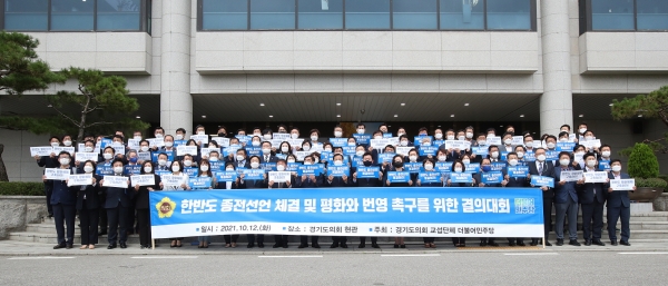 [충청뉴스큐] 경기도의회 교섭단체 더불어민주당은 12일 355회 임시회 2차 본회의에 앞서 의회 현관 앞에서 ‘한반도 종전선언 체결 및 평화와 번영을 위한 결의대회’를 개최했다.