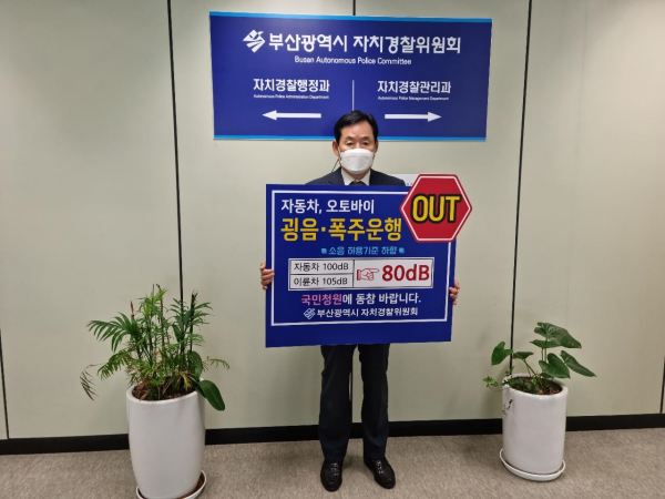 [충청뉴스큐] 부산시는 정용환 부산광역시자치경찰위원장이 지난 8일 ‘굉음유발 자동차·이륜차 소음 허용기준치 하향 건의’ 국민청원 챌린지에 동참했다고 밝혔다.
