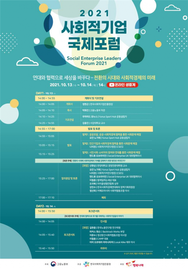 올해 국제포럼의 주제는 “연대와 협력으로 세상을 바꾸다: 전환의 시대와 사회적경제의 미래”로 코로나 대유행 이후 지속가능한 사회로의 변화 요구에 따른 사회적경제의 대응과 향후 발전 가능성을 조명하는 것으로 기획됐다.