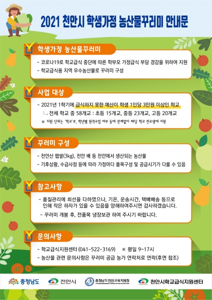 [충청뉴스큐] 천안시와 천안교육지원청은 코로나19로 학교급식이 중단됨에 따라 가정급식에 대한 학부모 부담 경감과 학생들의 건강증진, 지역농산물 소비확대를 위해 ‘학생가정 농산물 꾸러미 공급사업’을 추진한다.