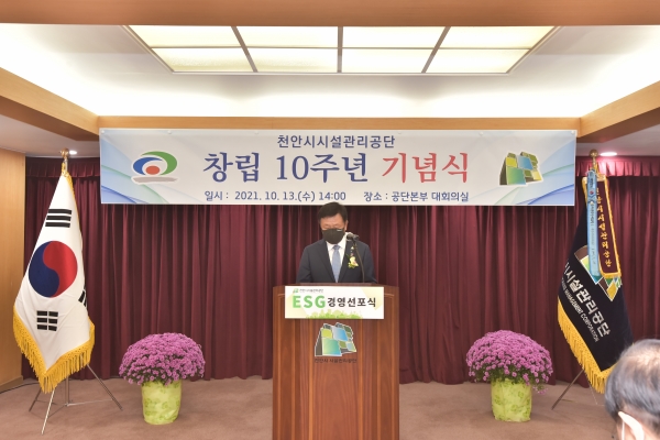 [충청뉴스큐] 천안시시설관리공단이 지난 13일 공단 본부 대회의실에서 창립 10주년 기념행사와 더불어 ‘ESG 경영’을 선포했다.