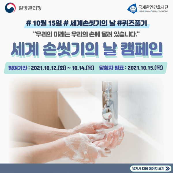 또한, 질병관리청은 올해 제14회 세계 손씻기의 날을 맞이해, 올바른 손씻기의 중요성을 홍보하고 대국민 인식도 제고를 위해 질병관리청 누리소통망을 통한 행사를 실시했다고 밝혔다.