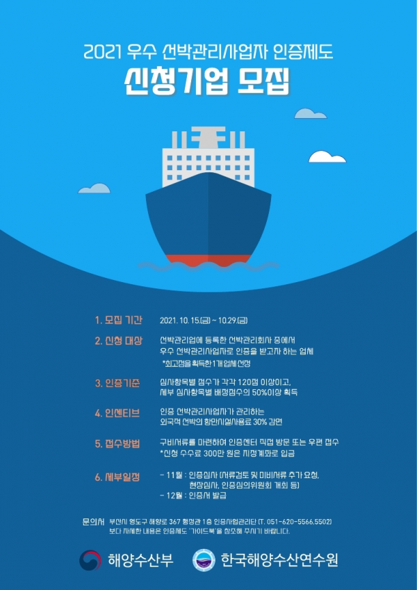 [충청뉴스큐] 해양수산부는 오는 10월 15일부터 29일까지 2주 동안 ‘우수 선박관리사업자 인증’ 공모 신청을 받는다.