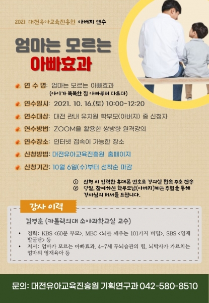 [충청뉴스큐] 대전유아교육진흥원은 유아기 자녀의 이해와 바람직한 아버지의 역할 제고를 돕기 위해 ‘엄마는 모르는 아빠효과’를 주제로 유치원, 어린이집 학부모 연수를 10월 16일 온라인으로 실시한다.