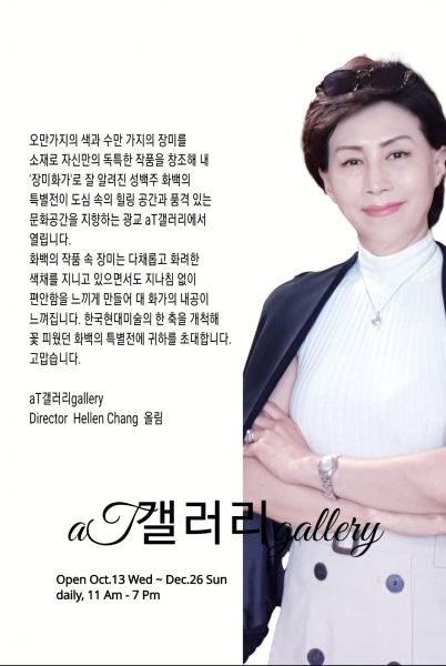 aT갤러리 헬렌 장 관장은 “aT갤러리는 국내외 저명 작가들의 수준 높은 작품을 전시하는 격조 있고 차원 높은 전문갤러리”며 “한국현대미술의 한 축을 개척하고 꽃 피웠던 성백주 화백의 특별전에 여러분을 초대한다”고 말했다.