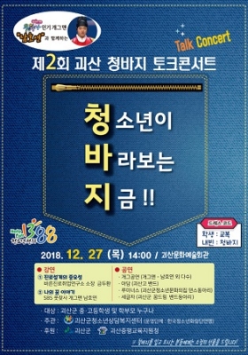 충북 괴산군 청소년상담복지센터 & 학교밖 청소년지원센터는 관내 청소년들을 대상으로 문화행사 및 의견수렴을 위한 ‘괴산 청·바·지 토크콘서트’를 오는 27일 오후 2시 괴산문화예술회관에서 개최한다고 밝혔다.