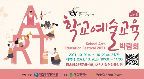 [충청뉴스큐] 대전광역시교육청은 10월 20일부터 10월 22일까지 평송청소년문화센터와 대전시립연정국악원에서 학생, 교사, 학부모, 지역예술인이 참여하는 ‘2021 제5회 학교예술교육박람회’를 개최한다.