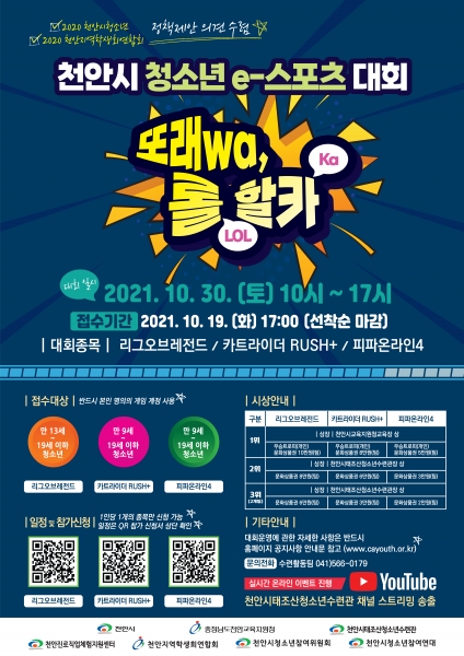 천안시 청소년 e-스포츠대회는 청소년들이 즐겨하고 선호하는 e-스포츠인 리그오브레전드 카트라이더 러쉬플러스 피파온라인4를 대회종목으로 선정했으며 오는 19일 오후 5시까지 참가자를 선착순 접수한다.