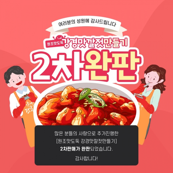 [충청뉴스큐] 지난 14일 오전 10시 랜선관람객들의 뜨거운 성원에 힘입어 ‘앙코르’판매한 강경젓갈김치만들기 키트 5백 개와 어리굴젓 키트 2백 개가 또 완판을 기록했다.