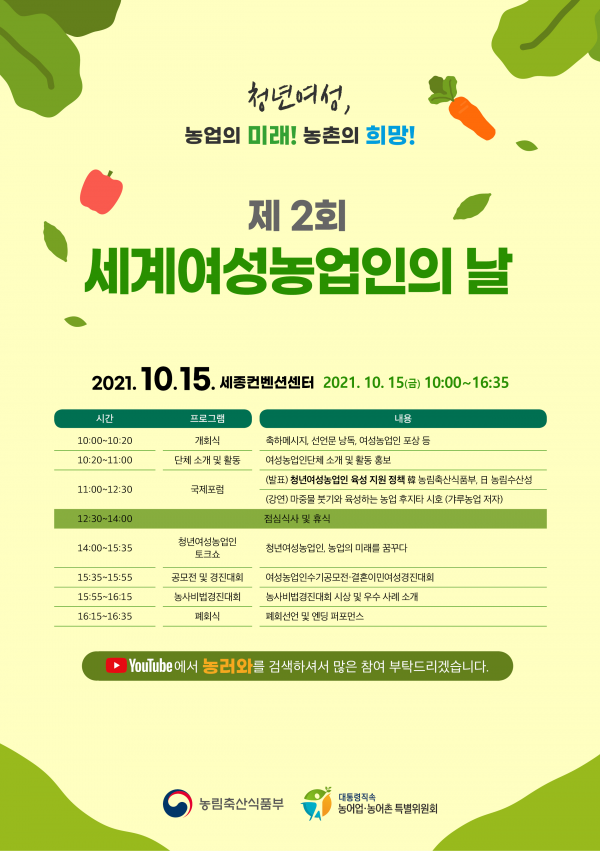 올해 행사는 청년 여성농업인 육성의 필요성을 강조하고 농업·농촌 진출을 독려하기 위해 ‘청년 여성농업인, 농업의 미래·농촌의 희망’을 주제로 정했으며 10월 15일 10시부터 오후 4시 35분까지 농식품부 유튜브 채널을 통해 행사 영상을 전국에 중계할 예정이다.
