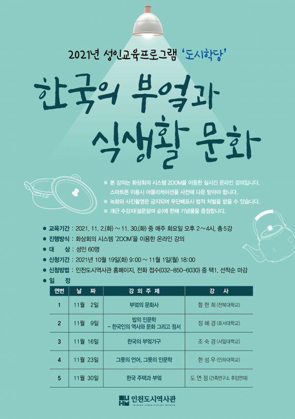 이번 강좌의 주제인 ‘한국의 부엌과 식생활 문화’는 지난 9월 개막한 인천도시역사관 특별전 ‘양은, 반짝이는 은이 아니라 죄송한다만.’과 연계해 기획됐으며 한국 부엌의 문화사를 비롯해 건축, 가구 등 부엌에 대한 다양한 분야를 다루고 한국의 밥과 그릇 등에 관한 인문학 강의도 진행할 예정이다.