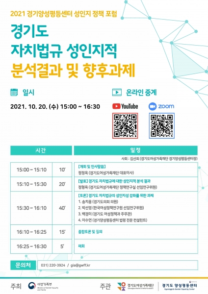 여성가족부가 주최하고 경기도양성평등센터가 주관하는 이번 포럼은 최근 재단이 완료한 ‘경기도 자치법규에 대한 성인지적 분석’ 연구 결과를 중심으로 진행한다.