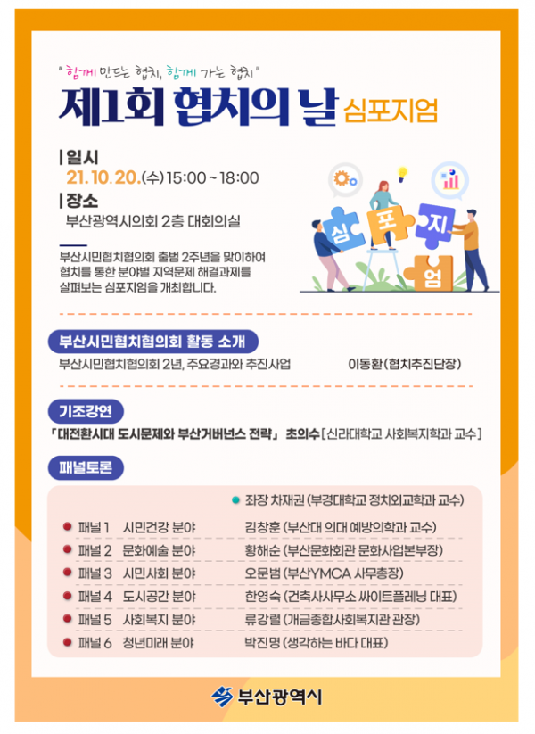 [충청뉴스큐] 부산시가 내일 오후 3시 부산광역시의회 2층 대회의실에서 ‘제1회 협치의 날 심포지엄’을 개최한다고 밝혔다.