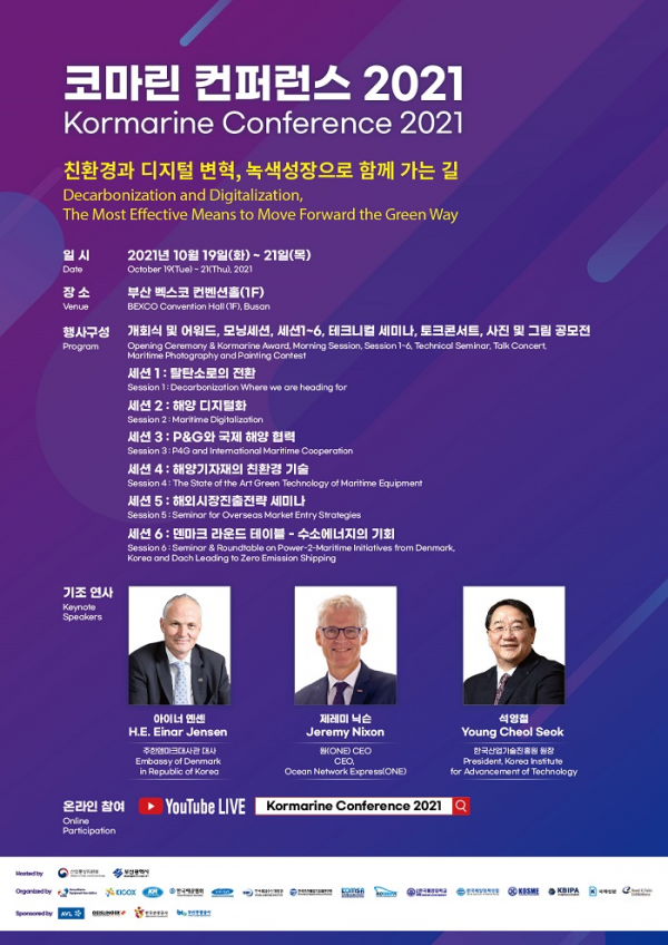 그리고 기조 강연은 아이너 얀센 주한 덴마크 대사의 ‘친환경과 디지털 변혁, 녹생성장으로 함께 가는 길’ 제레미 닉슨 ONE대표이사의 ‘해운정책과 해운시장의 흐름 및 디지털 해운’ 석영철 KIAT원장의 ‘조선해양기자재업체의 국책사업 선정과 수행까지 과정의 향후 발전 전략 모색’ 등이다.