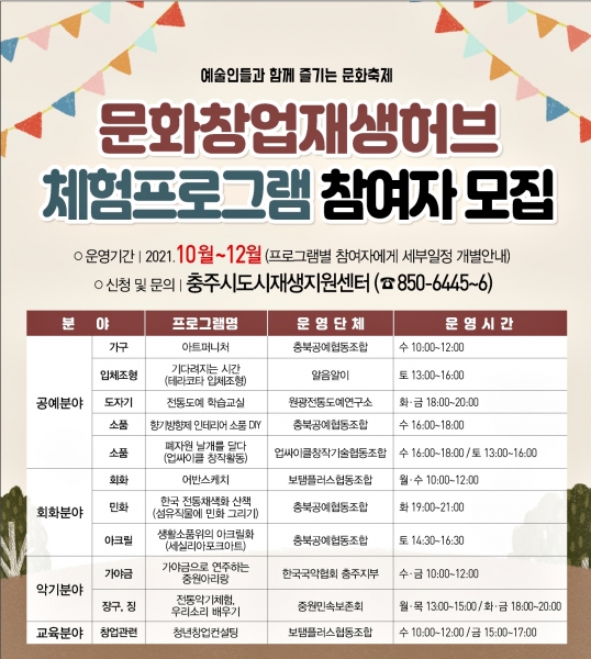 [충청뉴스큐] 충주시가 오는 12월까지 ‘문화창업재생허브 체험프로그램’ 참여자를 모집한다.