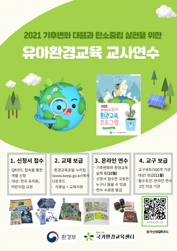 환경부는 연수 종료 후에 연수 이수자가 소속된 유치원·어린이집 500곳을 선정해 ‘2021 유아환경교육 과정 교사용 지도서’ 안에 담긴 교구세트를 보급해 환경교육 확산을 도모할 계획이라고 전했다.