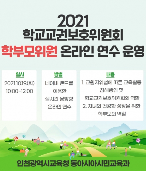 [충청뉴스큐] 인천광역시교육청은 19일 초·중·고등학교 학교교권보호위원회 학부모위원 650여명을 대상으로 역량 강화 온라인 연수를 실시했다.