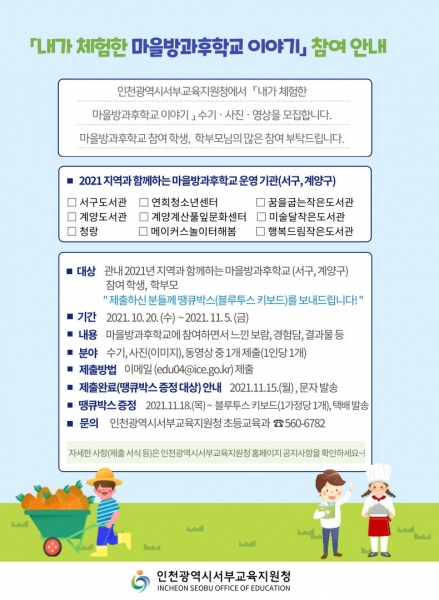 [충청뉴스큐] 인천서부교육지원청은 마을방과후학교 참여 우수사례를 홍보하기 위한 ‘내가 체험한 마을방과후학교 이야기’를 20일부터 모집한다.