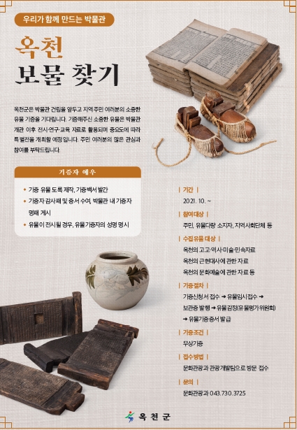 [충청뉴스큐] 옥천군은 옥천박물관 건립에 앞두고‘우리가 함께 만드는 박물관, 옥천 보물 찾기’라는 주제의 유물 기증 캠페인을 추진한다고 21일 밝혔다.
