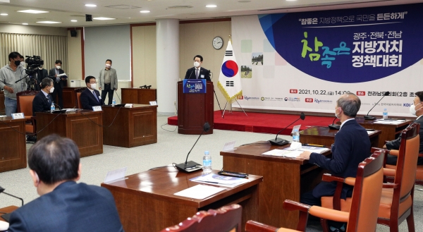 [충청뉴스큐] 김영록 전라남도지사는 22일 전남도의회에서 열린 ‘광주·전북·전남 참좋은 지방자치 정책대회’에 참석해 “지방자치 발전을 위해선 지역균형발전 강화와 함께 지역소멸위기에 대한 적극적 대응이 필요하다”고 밝혔다.