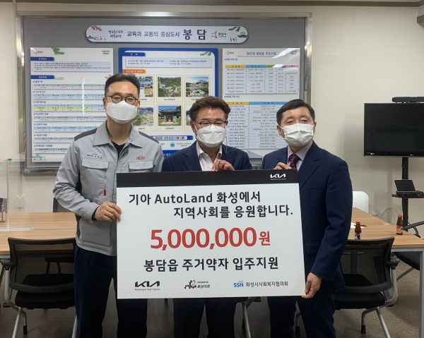 이날 봉담읍 읍장실에서 진행된 행사에는 김기용 봉담읍장과 최혁 화성시사회복지협의회 수석부회장, 기아화성공장 이상호 책임매니저 등이 참가했다.