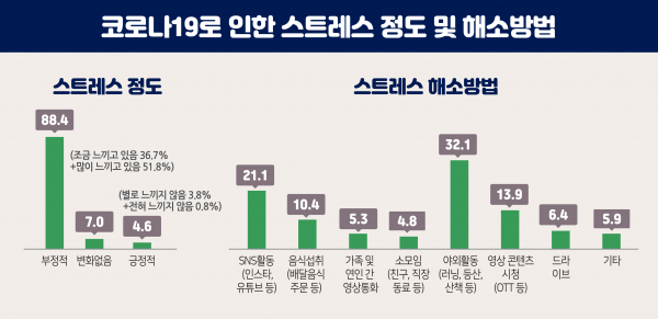 스트레스 해소 방법으로는 ‘야외활동’을 즐긴다는 답변이 32.1%로 가장 많았고 다음으로 ‘누리소통망 활동’, ‘유튜브나 넷플릭스 등 영상 콘텐츠 시청’, ‘음식 섭취’ 등의 순으로 나타났다.