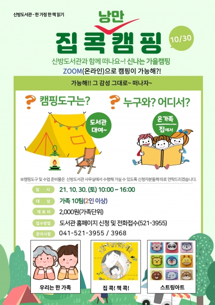 [충청뉴스큐] 가족특화도서관 ‘천안시 신방도서관’이 오는 30일 가족과 함께 떠나는 ‘집콕캠핑’ 프로그램을 실시한다.