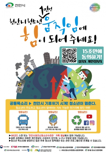시 관계자는 “지속가능한 개발목표로서 세계가 기후위기에 집중하는 만큼, 이번 캠페인은 간편한 동의투표 참여를 통해 청소년들도 기후위기 심각성을 알고 동시에 청소년 참여가 어렵지 않다는 것을 인지하게 되길 기대한다”며 “이를 통해 천안시 청소년들이 사회 구성원으로서 소속감과 책임감을 느끼길 바란다”고 말했다.