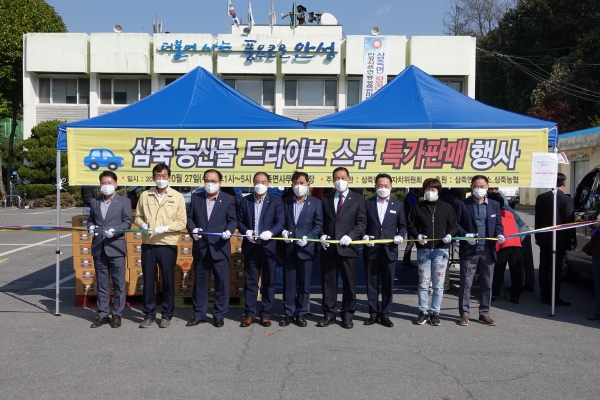 이날 드라이브스루 판매행사는 삼죽면 주민자치위원회에서 주관하고 면사무소 주차장에서 진행됐으며 코로나19 장기화로 어려움을 겪고 있는 지역 농업인들의 농산물 판매와 홍보를 위해 기획됐다.