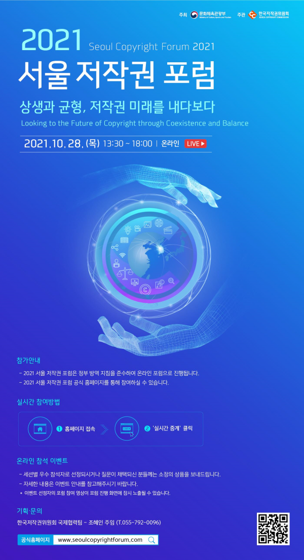 [충청뉴스큐] 문화체육관광부는 한국저작권위원회와 함께 10월 28일 오후 1시 30분, ‘2021 서울 저작권 포럼’을 온라인으로 개최한다.