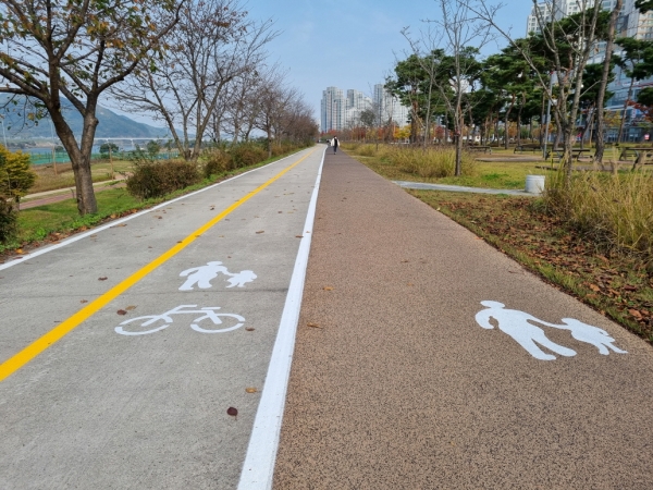 이에 시는 전체 제방도로를 고무칩 포장구간은 노면표시로 보행자 전용도로로 유도하고 콘크리트 포장 구간은 중앙차선 도색으로 보행자, 자전거의 우측통행 및 혼용 이용할 수 있도록 개선했다.