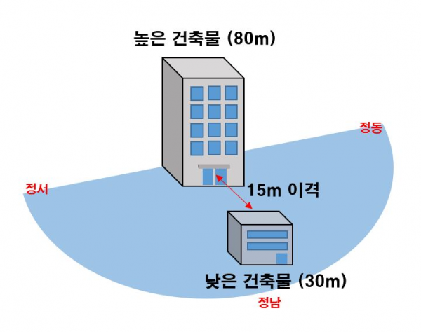낮은 건물이 전면에 있는 경우 후면의 높은 건물의 채광에 미치는 영향이 크지 않아 낮은 건물의 0.5배 이상으로 건축조례로 정하는 거리를 이격하도록 개선된다.