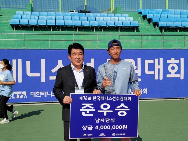 [충청뉴스큐] 세종특별자치시청 테니스팀 소속 국가대표 홍성찬 선수와 국군체육부대 신산희 선수로 이뤄진 팀이 지난 30일 경북 김청 종합스포츠타운에서 열린 ‘제76회 한국테니스선수권대회’에서 남자 복식 부문 우승을 차지했다.