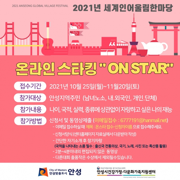 [충청뉴스큐] 안성시는 지난 25일부터 이달 20일까지 안성시 세계인어울림한마당 온라인스타킹 “ON STAR” 참가자를 모집하고 있다.