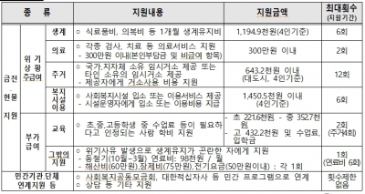그 밖에도 주거지원, 교육지원, 동절기 연료비 등도 위기가구 상황에 따라 지원 받을 수 있다.