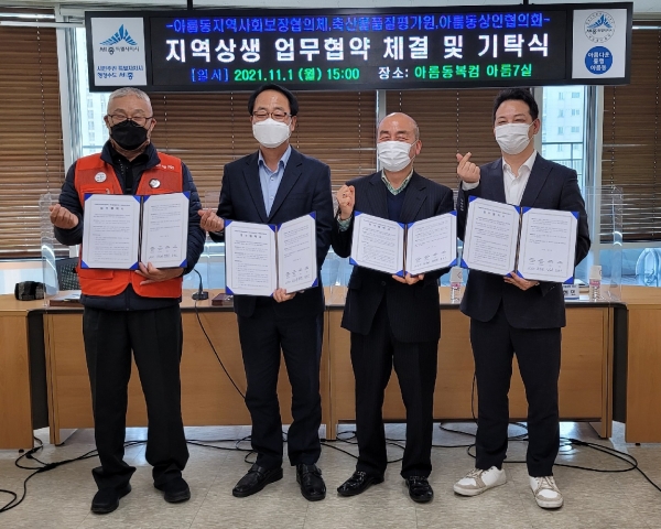[충청뉴스큐] 세종특별자치시 아름동지역사회보장협의체가 1일 축산물품질평가원, 아름동상인협의회와 지역내 상생 협력을 통한 사회안정망 구축을 위해 업무협약을 체결했다.