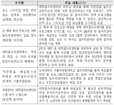 청년들은 사례집에서 대학일자리센터의 전문상담과 다양한 프로그램이 진로결정과 취업에 많은 도움이 되었으며, 일자리센터를 통해 취업성공패키지.내일배움카드.중소기업 탐방 등 정부 지원제도와도 연계가 가능하여 알차게 취업을 준비할 수 있었다고 전했다.