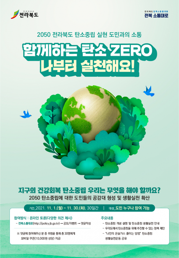 전북도는 오는 12월 개최 예정인 2050 탄소중립 선진화 포럼의 사전 행사로 오는 30일까지 ‘전북소통대로 온라인 댓글 토론’을 진행한다고 밝혔다.