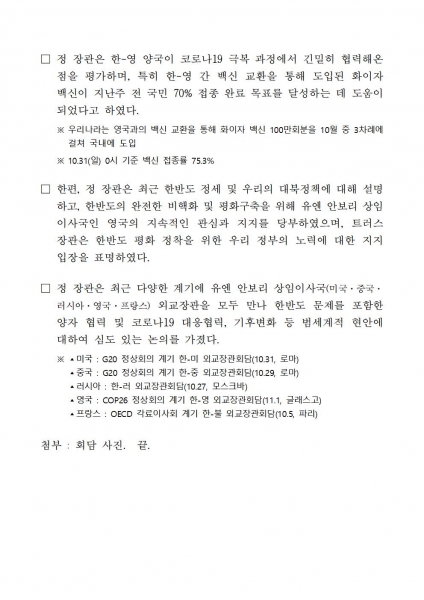 한편 정 장관은 최근 한반도 정세 및 우리의 대북정책에 대해 설명하고 한반도의 완전한 비핵화 및 평화구축을 위해 유엔 안보리 상임이사국인 영국의 지속적인 관심과 지지를 당부했으며 트러스 장관은 한반도 평화 정착을 위한 우리 정부의 노력에 대한 지지 입장을 표명했다.