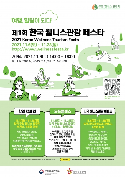 [충청뉴스큐] 문화체육관광부와 한국관광공사는 오는 11월 6일부터 28일까지 웰니스 관광상품 할인 및 무료체험행사를 중심으로 하는 ‘제1회 한국 웰니스관광 페스타’를 개최한다.