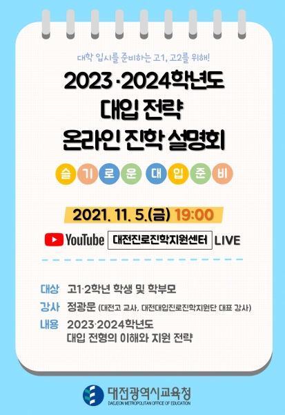 [충청뉴스큐] 대전광역시교육청은 예비 수험생인 고1, 2 학생 및 학부모를 대상으로 ‘2023·2024 대입 전략 온라인 진학설명회’를 11월 5일 오후 7시 대전진로진학지원센터 유튜브 채널을 통해 실시간으로 실시한다고 밝혔다.