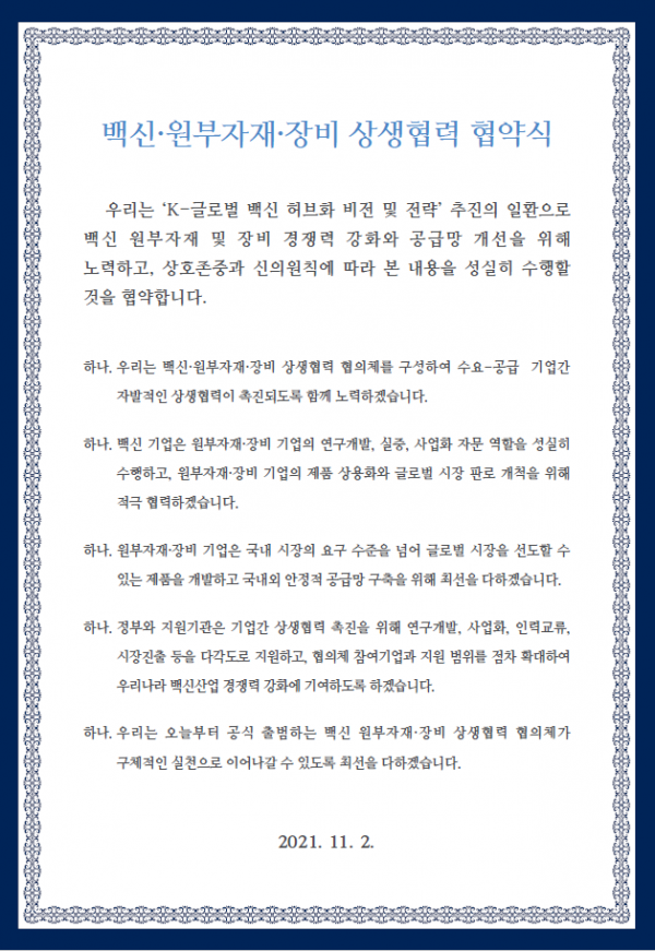 백신 기업은 중소 원부자재·장비 기업의 연구개발·실증·사업화에 대한 자문 역할과 제품화 및 글로벌 시장 판로개척을 위해 적극 협력하고 중소 원부자재·장비 기업은 국내 시장의 요구 수준을 넘어 글로벌 시장을 선도할 수 있는 제품을 개발하고 국내외 안정적인 공급망 구축을 위해 협력할 예정이다.