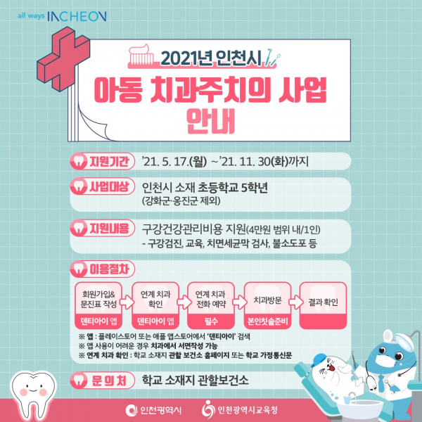 [충청뉴스큐] 인천광역시는 11월 말까지 관내 초등학교 5학년생을 대상으로 ‘아동 치과주치의’사업을 실시한다고 밝혔다.