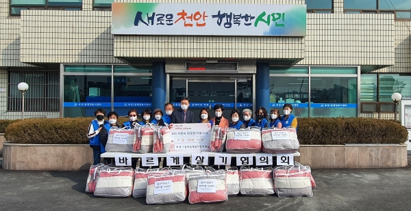 [충청뉴스큐] 천안시 부성1동은 바르게살기협의회가 지난 3일 지역 내 이웃을 위해 이불 18채를 기부했다고 밝혔다.