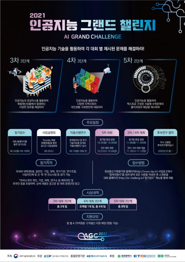 [충청뉴스큐] 과학기술정보통신부는 ‘인공지능 대규모 도전잇기’ 5차대회 2단계 결과를 11월 5일 인공지능 대규모 도전잇기 누리집를 통해 발표하고 이어서 3·4차대회 3단계가 11월 10일부터 11월 12일까지 개최된다고 밝혔다.